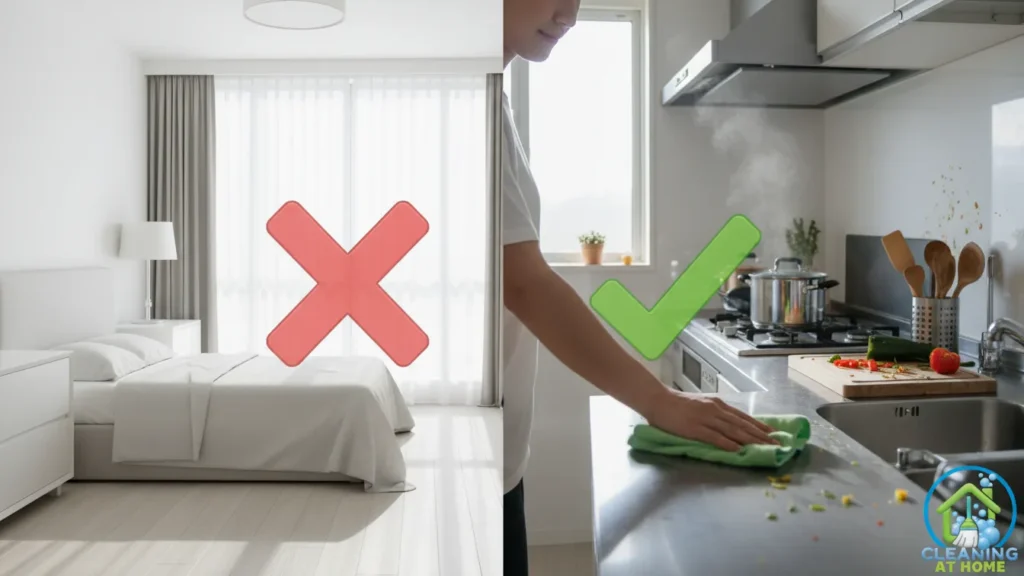 On the other hand, many areas do not need daily cleaning. Bedrooms that haven’t been used much, shelves without dust, decorative surfaces, windows, baseboards, and low-traffic floors can usually be skipped. Cleaning them every day adds time without improving how the home looks or feels.