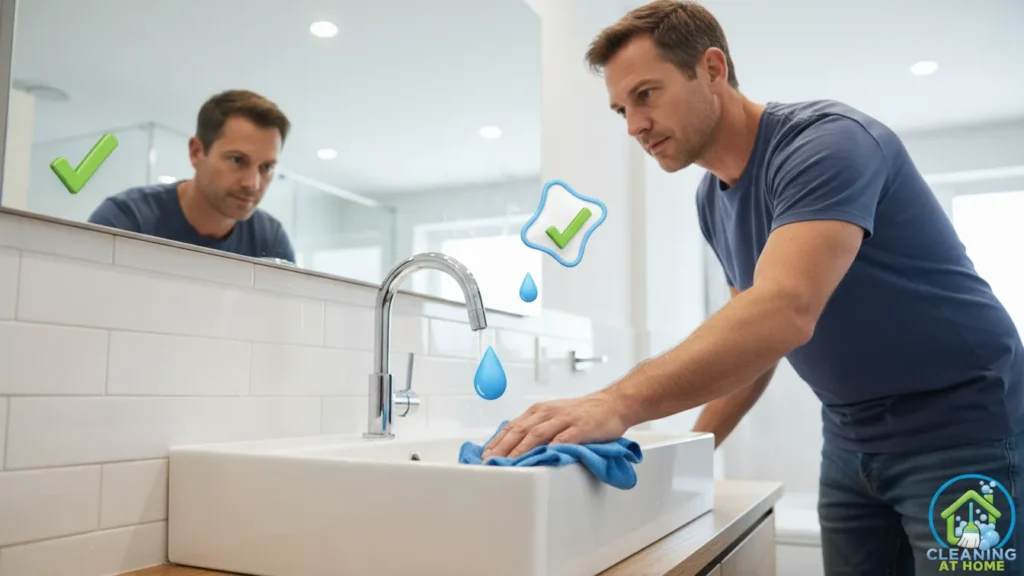 A fast daily bathroom routine starts with the sink area. Wiping the faucet, counter, and sink bowl removes visible residue and instantly improves how the space looks. This doesn’t require product every time — often a damp cloth is enough when done daily.