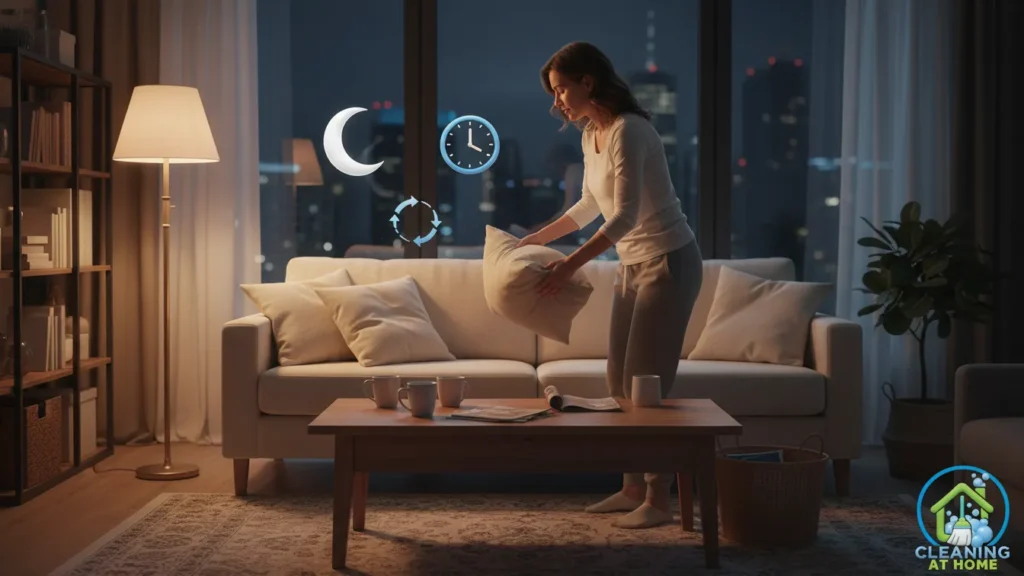 This usually means clearing the main surfaces you’ll use in the morning. Putting dishes away, wiping the kitchen counter, straightening the living area, and doing a quick pickup of visible clutter are often enough. These actions take just a few minutes but have a big impact on how the home feels the next day.
