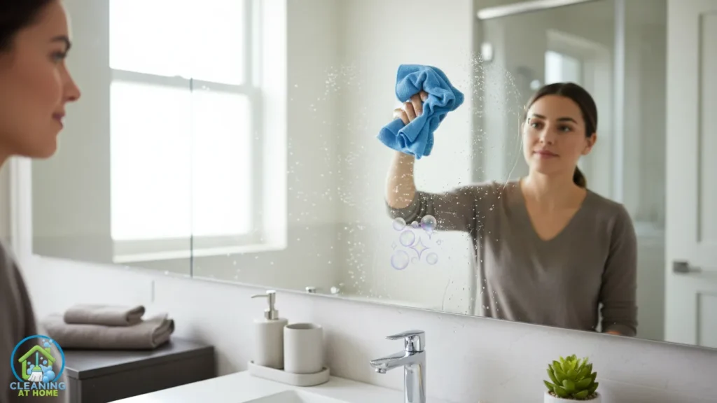 Bathroom mirrors and glass surfaces can look dirty even after cleaning if streaks are left behind. Water spots, toothpaste spray, and fingerprints show up easily under bathroom lighting, which is why this step needs a simple but intentional approach. The goal is clarity, not constant re-cleaning.